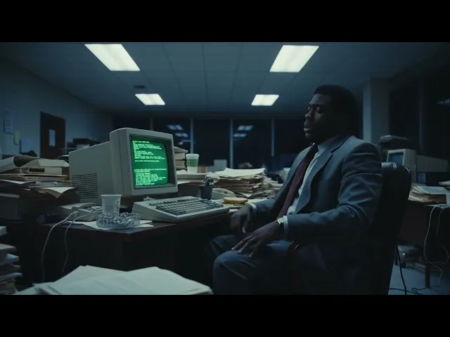 Detective: Middle-aged man in a worn trench coat, dimly lit office, cinematic noir atmosphere.