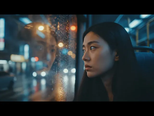 Prompt: Close-up with very shallow depth of field, a young woman's face, looking out a bus window at the passing city lights with her reflection faintly visible on the glass, inside a bus at night during a rainstorm, melancholic mood with cool blue tones, moody, cinematic.