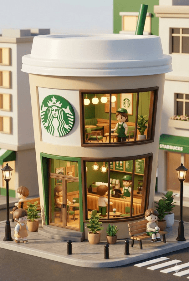 3D chibi-style miniature concept store of {Brand Name}, creatively designed with an exterior inspired by the brand's most iconic product or packaging (such as a giant {brand's core product, e.g., chicken bucket/hamburger/donut/roast duck}). The store features two floors with large glass windows clearly showcasing the cozy and finely decorated interior: {brand's primary color}-themed decor, warm lighting, and busy staff dressed in outfits matching the brand. Adorable tiny figures stroll or sit along the street, surrounded by benches, street lamps, and potted plants, creating a charming urban scene. Rendered in a miniature cityscape style using Cinema 4D, with a blind-box toy aesthetic, rich in details and realism, and bathed in soft lighting that evokes a relaxing afternoon atmosphere.