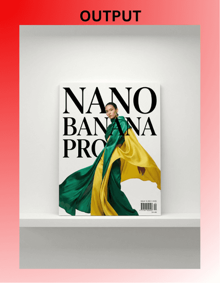 A photo of a glossy magazine cover, the cover has the large bold words "Nano Banana Pro". The text is in a serif font, black on white, and fills the view. No other text. In front of the text there is a dynamic portrait of a person in green and banana yellow colored high-end fashion. Put the issue number and today's date in the corner along with a barcode and a price. The magazine is on a white shelf against a wall.