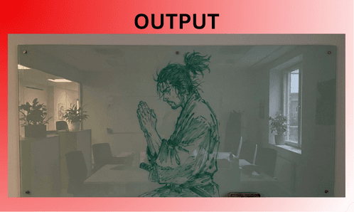 Create a photo of vagabonds musashi praying drawn on a glass whiteboard in a slightly faded green marker