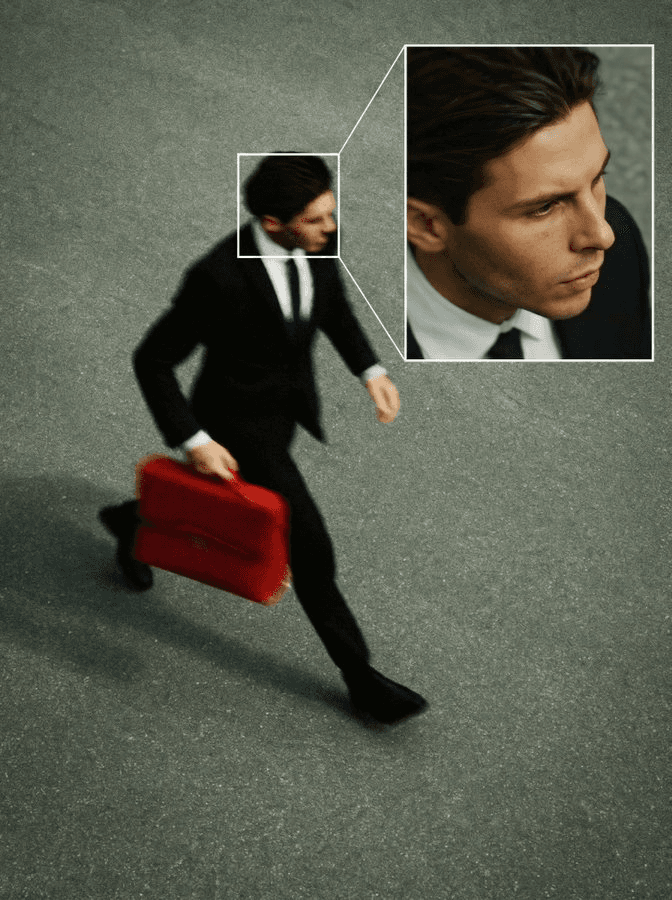 Create a high angle CCTV surveillance shot using the uploaded image as the source. Detect every visible person in the image and automatically draw a white rectangular bounding box around each face. For the most prominent person, add a large zoom in inset: a sharp, enhanced close-up of their face displayed in a floating rectangular frame connected with a thin white line.Keep the main image slightly noisy and security camera like (soft grain, slight distortion, muted colors), while the zoom in face box should be clearer, brighter, and more detailed. No text, no timestamps, no overlays except the boxes and connecting line. Maintain the original scene layout, angle, and environment of the uploaded image