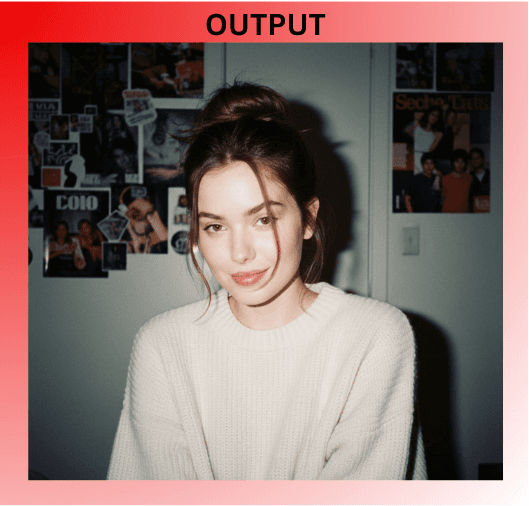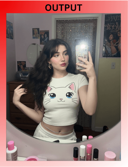 { "subject": { "description": "A young woman taking a mirror selfie with very long voluminous dark waves and soft wispy bangs", "age": "young adult", "expression": "confident and slightly playful", "hair": { "color": "dark", "style": "very long, voluminous waves with soft wispy bangs" }, "clothing": { "top": { "type": "fitted cropped t-shirt", "color": "cream white", "details": "features a large cute anime-style cat face graphic with big blue eyes, whiskers, and a small pink mouth" } }, "face": { "preserve_original": true, "makeup": "natural glam makeup with soft pink dewy blush and glossy red pouty lips" } }, "accessories": { "earrings": { "type": "gold geometric hoop earrings" }, "jewelry": { "waistchain": "silver waistchain" }, "device": { "type": "smartphone", "details": "patterned case" } }, "photography": { "camera_style": "early-2000s digital camera aesthetic", "lighting": "harsh super-flash with bright blown-out highlights but subject still visible", "angle": "mirror selfie", "shot_type": "tight selfie composition", "texture": "subtle grain, retro highlights, V6 realism, crisp details, soft shadows" }, "background": { "setting": "nostalgic early-2000s bedroom", "wall_color": "pastel tones", "elements": [ "chunky wooden dresser", "CD player", "posters of 2000s pop icons", "hanging beaded door curtain", "cluttered vanity with lip glosses" ], "atmosphere": "authentic 2000s nostalgic vibe", "lighting": "retro" } }