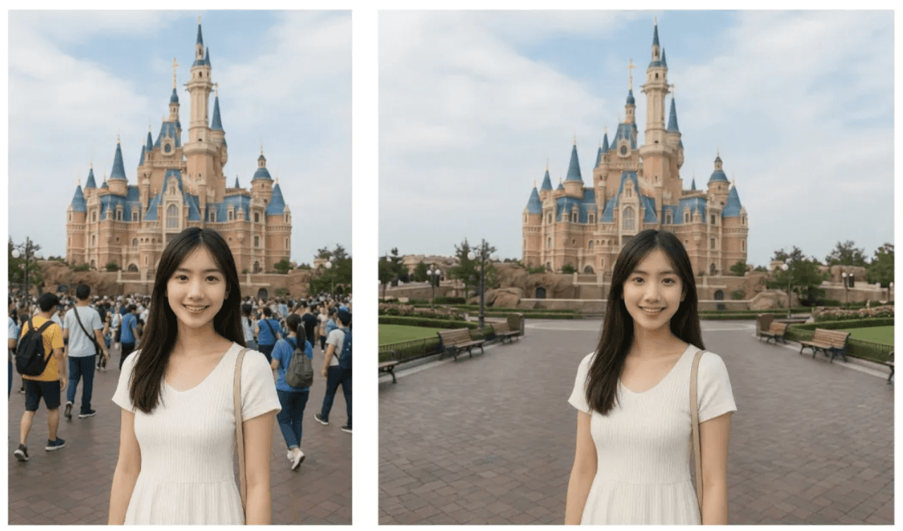 Removes unwanted people from backgrounds and fills the space with logical textures.