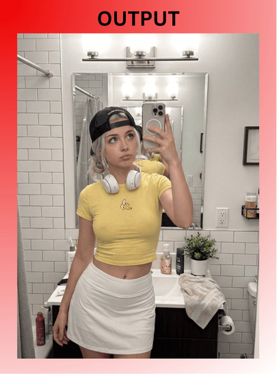 { "subject": { "description": "Young woman taking bathroom mirror selfie, innocent doe eyes but the outfit tells another story", "mirror_rules": "facing mirror, hips slightly angled, close to mirror filling frame", "age": "early 20s", "expression": { "eyes": "big innocent doe eyes looking up through lashes, 'who me?' energy", "mouth": "soft pout, lips slightly parted, maybe tiny tongue touching corner", "brows": "soft, slightly raised, faux innocent", "overall": "angel face but devil body, the contrast is the whole point" }, "hair": { "color": "platinum blonde", "style": "messy bun or claw clip, loose strands framing face, effortless" }, "body": { "waist": "tiny", "ass": "round, full, fabric of shorts riding up and clinging between cheeks, every curve visible through thin athletic material", "thighs": "thick, soft, shorts barely containing" }, "clothing": { "top": { "type": "ULTRA mini crop tee", "color": "yellow", "graphic": "single BANANA logo/graphic", "fit": "barely containing chest, fabric stretched tight, ends just below, shows full stomach" }, "bottom": { "type": "tight tennis skort or athletic booty shorts", "color": "white", "material": "thin stretchy athletic fabric", "fit": "vacuum tight, riding up, clinging between cheeks, fabric creases visible, leaving nothing to imagination" } }, "face": { "features": "pretty - big eyes, small nose, full lips", "makeup": "minimal, natural, lip gloss, no-makeup makeup" } }, "accessories": { "headwear": { "type": "Goorin Bros cap", "details": "black with animal patch, worn backwards or tilted" }, "headphones": { "type": "over-ear white headphones", "position": "around neck" }, "device": { "type": "iPhone", "details": "visible in mirror, held at chest level" } }, "photography": { "camera_style": "casual iPhone mirror selfie, NOT professional", "quality": "iPhone camera - good but not studio, realistic social media quality", "angle": "eye-level, straight on mirror", "shot_type": "3/4 body, close to mirror", "aspect_ratio": "9:16 vertical", "texture": "natural, slightly grainy iPhone look, not over-processed" }, "background": { "setting": "regular apartment bathroom", "style": "normal NYC apartment bathroom, not luxury", "elements": [ "white subway tile walls", "basic bathroom mirror with good lighting above", "simple white sink vanity", "toiletries visible - skincare bottles, toothbrush holder", "towel hanging on hook", "maybe shower curtain edge visible", "small plant on counter" ], "atmosphere": "real bathroom, lived-in, normal home", "lighting": "good vanity lighting above mirror - bright, even, flattering but not studio" }, "vibe": { "energy": "innocent face + sinful body = the whole game", "mood": "just got ready for tennis but making content first, 'what?' expression while wearing basically nothing", "contrast": "doe eyes + ass eating the shorts = lethal", "caption_energy": "'tennis anyone? 🍌' or 'running late oops'" } }