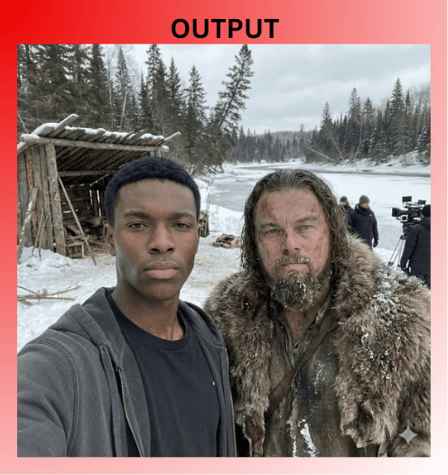 "I'm taking a selfie with [movie character] on the set of [movie name]. Keep the person exactly as shown in the reference image with 100% identical facial features, bone structure, skin tone, facial expression, pose, and appearance. 1:1 aspect ratio, 4K detail