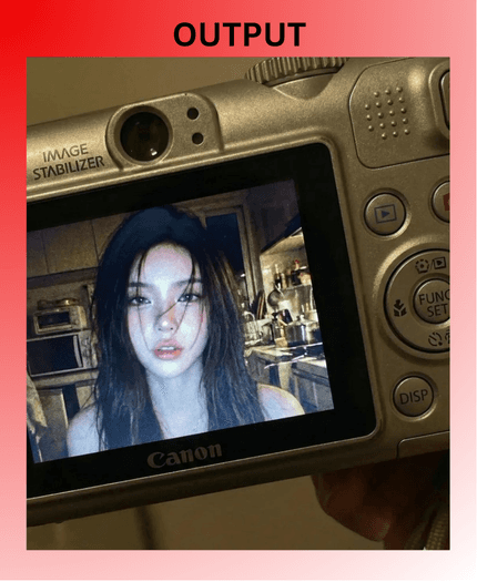 Use facial feature of attached photo. A close-up shot of a young woman displayed on the screen of a compact Canon digital camera. The camera body surrounds the image with its buttons, dials, and textured surface visible, including the FUNC/SET wheel, DISP button, and the "IMAGE STABILIZER" label along the side. The photo on the screen shows the woman indoors at night, illuminated by a bright built-in flash that creates sharp highlights on her face and hair. She has long dark hair falling across part of her face in loose strands, with a soft, slightly open-lip expression. The flash accentuates her features against a dim, cluttered kitchen background with appliances, shelves, and metallic surfaces softly blurred. The mood is candid, raw, nostalgic, and reminiscent of early 2000s digital camera snapshots. Colors are slightly muted with cool undertones, strong flash contrast, and natural grain from the display. No text, no logos inside the photo preview itself. Scale ratio: 4:5 vertical Camera: compact digital camera simulation Lens: equivalent to 28–35mm Aperture: f/2.8 ISO: 400 Shutter speed: 1/60 with flash White balance: auto flash Lighting: harsh direct flash on subject, ambient low light in the background Color grading: nostalgic digital-camera tones, high contrast flash, subtle display grain, authentic screen glow