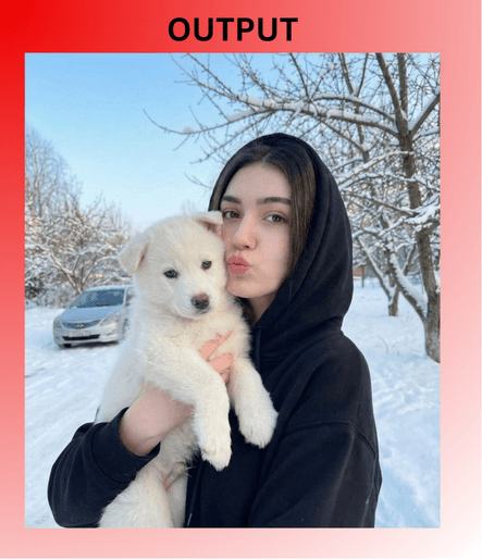 { "image_description": { "subject": { "face": { "preserve_original": true, "reference_match": true, "description": "The girl's facial features, expression, and identity must remain exactly the same as the reference image." }, "girl": { "age": "young", "hair": "long, wavy brown hair", "expression": "puckering her lips toward the camera", "clothing": "black hooded sweatshirt" }, "puppy": { "type": "small white puppy", "eyes": "light blue", "expression": "calm, looking forward" } }, "environment": { "setting": "outdoors in a winter scene", "elements": [ "snow covering the ground", "bare trees in the background", "blurred silver car behind the girl" ], "sky": "clear light blue sky" }, "mood": "cute, natural, winter outdoor moment", "camera_style": "soft depth of field, natural daylight, subtle winter tones" } }