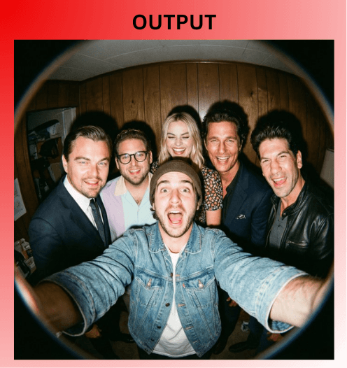 A film-like fisheye wide-angle 360-degree selfie without any camera or phone visible in the subject's hands. A real and exaggerated selfie of [person from uploaded image] with [CHARACTERS]. They are making faces at the camera. (more detailed version) A hyper-realistic fisheye wide-angle selfie, captured with a vintage 35mm fisheye lens creating heavy barrel distortion. without any camera or phone visible in the subject's hands. Subject & Action: A close-up, distorted group photo featuring [Person From Uploaded Image] taking selfie with [CHARACTERS]. Everyone is making wild, exaggerated faces, squinting slightly from the flash. Lighting & Texture: Harsh, direct on-camera flash lighting that creates hard shadows behind the subjects. Authentic film grain, slight motion blur on the edges, and chromatic aberration. It looks like a candid, amateur snapshot as if captured during a chaotic behind-the-scenes moment, not a studio photo