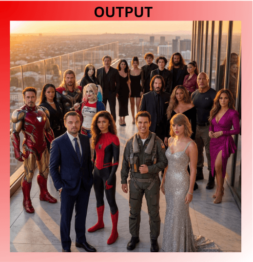 Create a hyper-realistic, ultra-sharp, full-color large-format image featuring a massive group of celebrities from different eras, all standing together in a single wide cinematic frame. The image must look like a perfectly photographed editorial cover with impeccable lighting, lifelike skin texture, micro-details of hair, pores, reflections, and fabric fibers. GENERAL STYLE & MOOD: Photorealistic, 8k, shallow depth of field, soft natural fill light + strong golden rim light. High dynamic range, calibrated color grading. Skin tones perfectly accurate. Crisp fabric detail with individual threads visible. Balanced composition, slightly wide-angle lens (35mm), center-weighted. All celebrities interacting naturally, smiling, posing, or conversing. Minimal background noise, but with enough world-building to feel real. THE ENVIRONMENT: A luxurious open-air rooftop terrace at sunset overlooking a modern city skyline. Elements include: Warm golden light wrapping around silhouettes. Polished marble