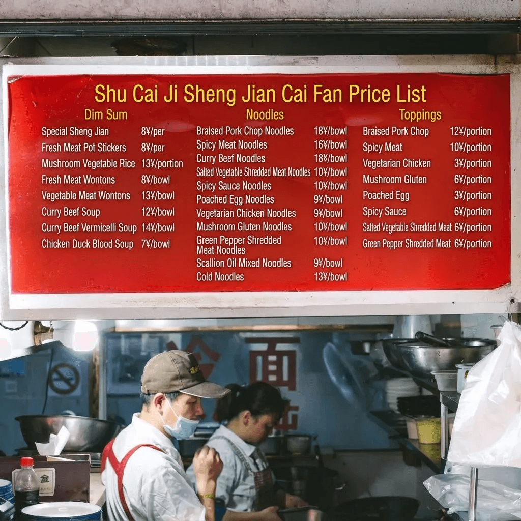 Translate the Chinese dish names on the wall menu into English for foreign tourists. Texture Preservation : Crucial! Maintain the original aged, greasy, and textured look of the wall/paper. The new English text should look like it was written/printed on the same surface, with slight fading or wear to match. Currency : Keep the '¥' symbol and price numbers exactly as they are ; do not convert currency. Layout : align the English translations next to or replacing the Chinese characters naturally