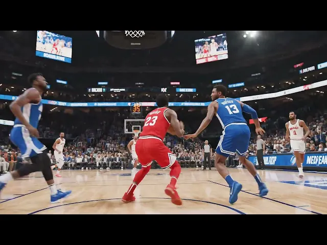 "A basketball player in a red jersey dribbles rapidly down the court, faking left before spinning right to evade a defender. He leaps high for a slam dunk, the ball slamming through the hoop with a satisfying thud. SFX: Crowd cheers erupt, sneakers squeak on the polished floor. Fast-paced action in a realistic sports arena, with dynamic tracking shots and bright stadium lights."