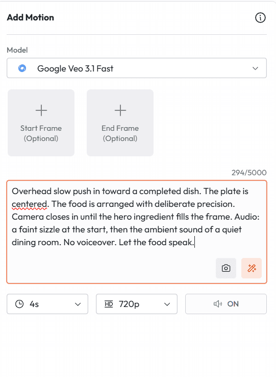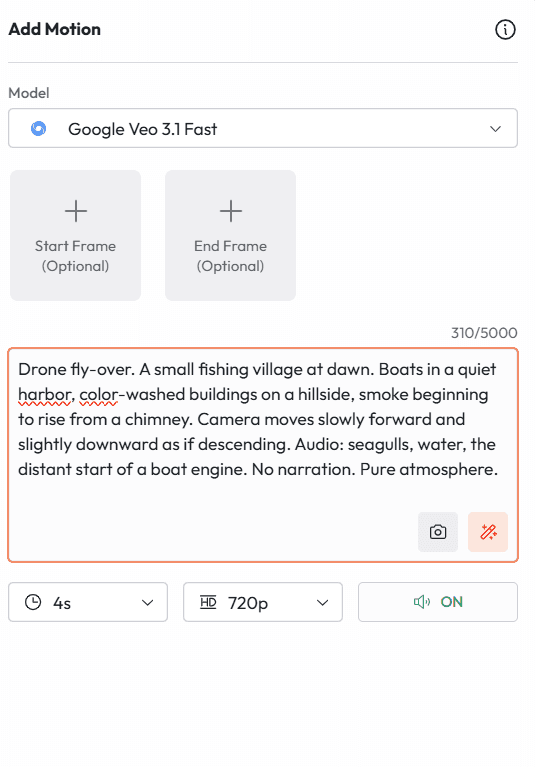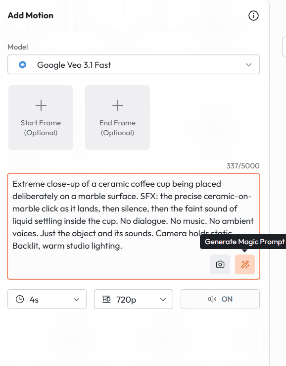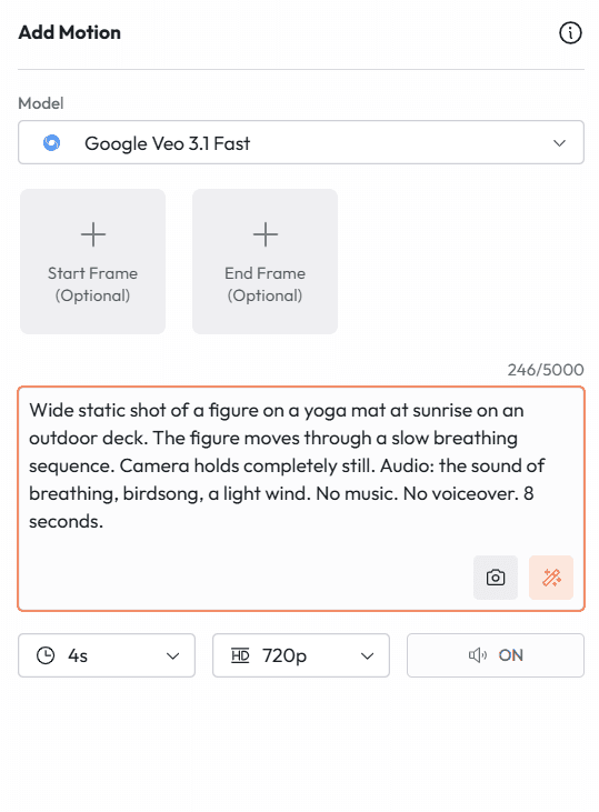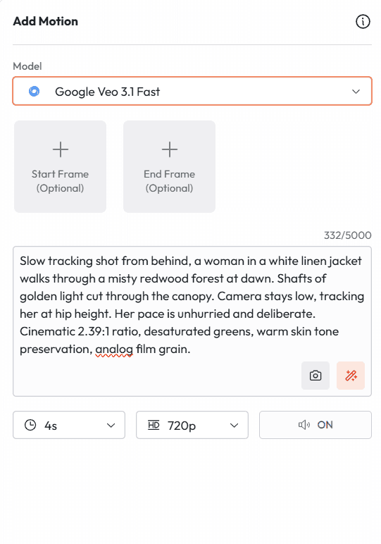 First and Last Frame | Define start and end frames; AI fills the transition | Cinematic transitions, reveals | Yes |