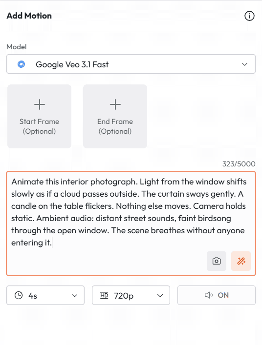 The prompt in image to video mode describes the motion, camera behavior, and audio. You do not need to re-describe everything visible in the image. Focus on what changes: what moves, how it moves, and what the camera does.